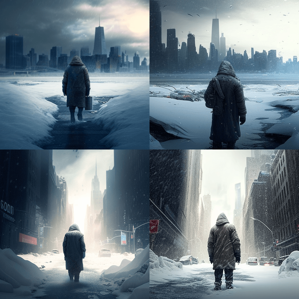 백 투 더 퓨처(Back to the Future) 스타일로, 시간 여행자가 날아다니는 드로리안(DeLorean)을 타고 막 도착한 1985년 분주한 마을 광장의 장면입니다. 한 무리의 십대들은 자동차가 연기와 불의 흔적을 남기고 미래로 사라지는 것을 경외심을 갖고 지켜봅니다. - In the style of The Day After Tomorrow, a scene of a frozen New York City in 2075 after a catastrophic climate change event has caused the polar ice caps to melt and a massive storm to hit the city. A lone figure in a parka trudges through the snow, searching for survival.