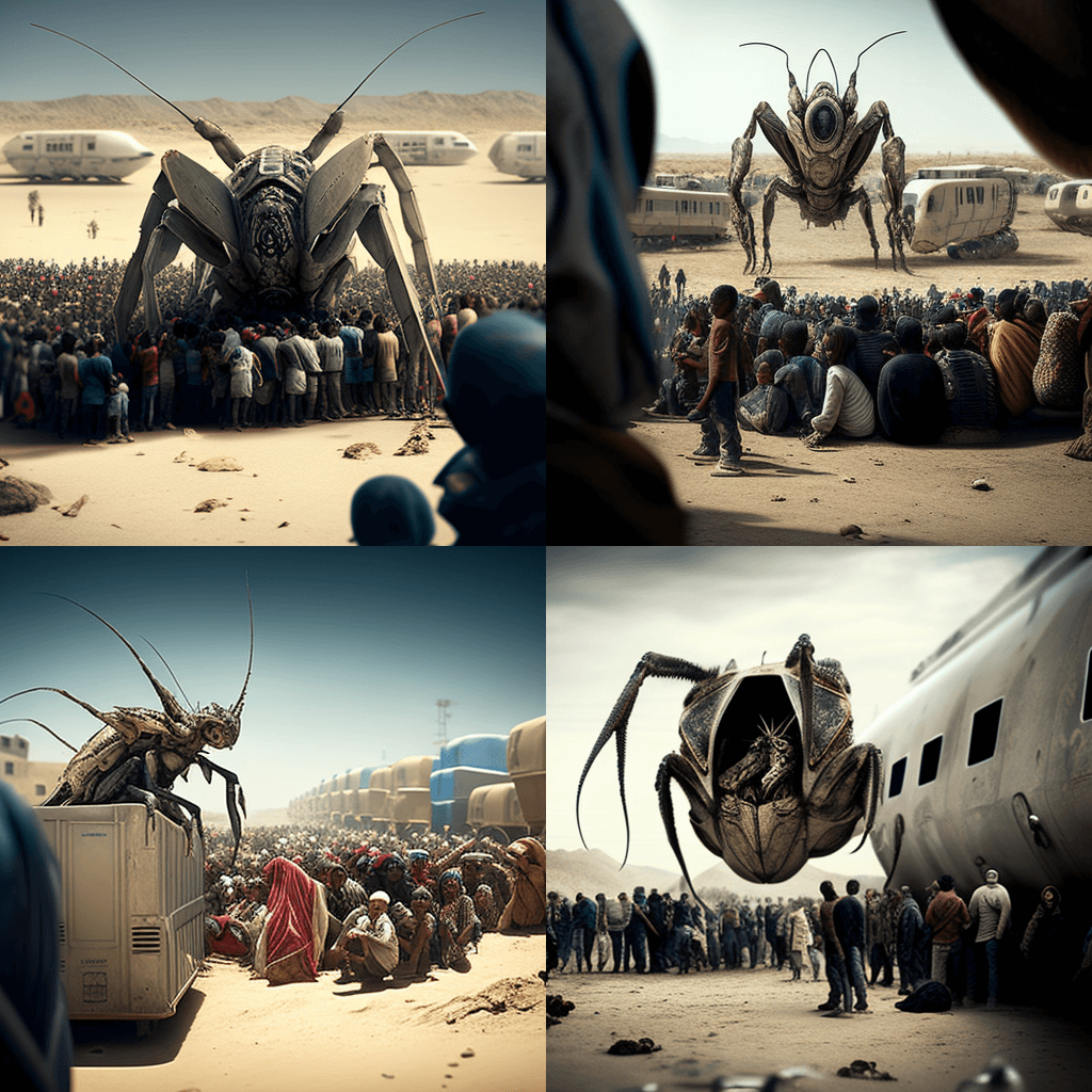 "세계 전쟁 스타일": 지구 침공 – 2072년, 지구는 강력한 외계 세력의 공격을 받고 있습니다. 파괴와 혼돈의 현장, 폐허가 된 도시 위로 우뚝 솟은 외계인. - “In the Style of Dune”: The Rise of the Sand People – In 2080, a new desert-dwelling culture has emerged, controlling vast stretches of desert lands. A scene of a caravan of sand-covered vehicles, led by a mysterious leader.
