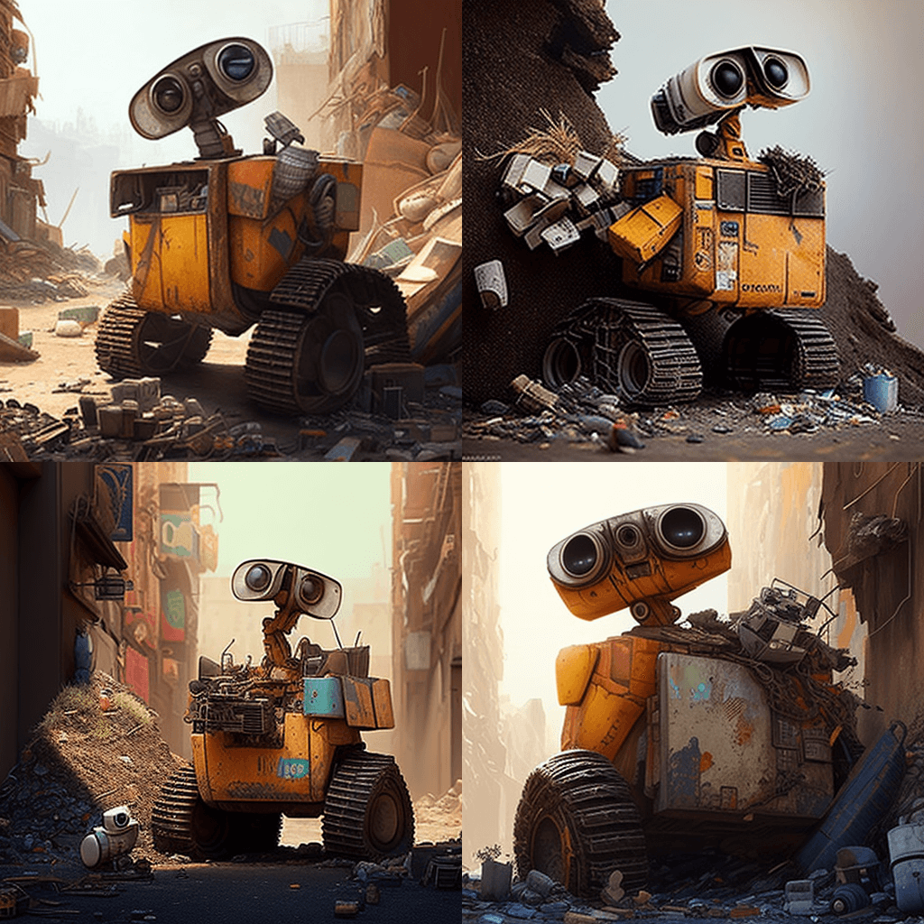 터미네이터 스타일로, 로봇과 사이보그가 세계를 장악하기 위한 잔혹한 전쟁을 벌이는 2043년 전장의 한 장면입니다. 빛나는 금속 엑소수트를 입은 한 인물이 혼돈 위로 우뚝 솟아 거대한 플라즈마 캐논을 휘두릅니다. - In the style of Wall-E, a scene of a floating city in 2200 where humans live in a luxurious space station and robots do all the work. A roving robot named Wall-E and his companion Eve, explore a discarded landfill filled with old Earth relics.