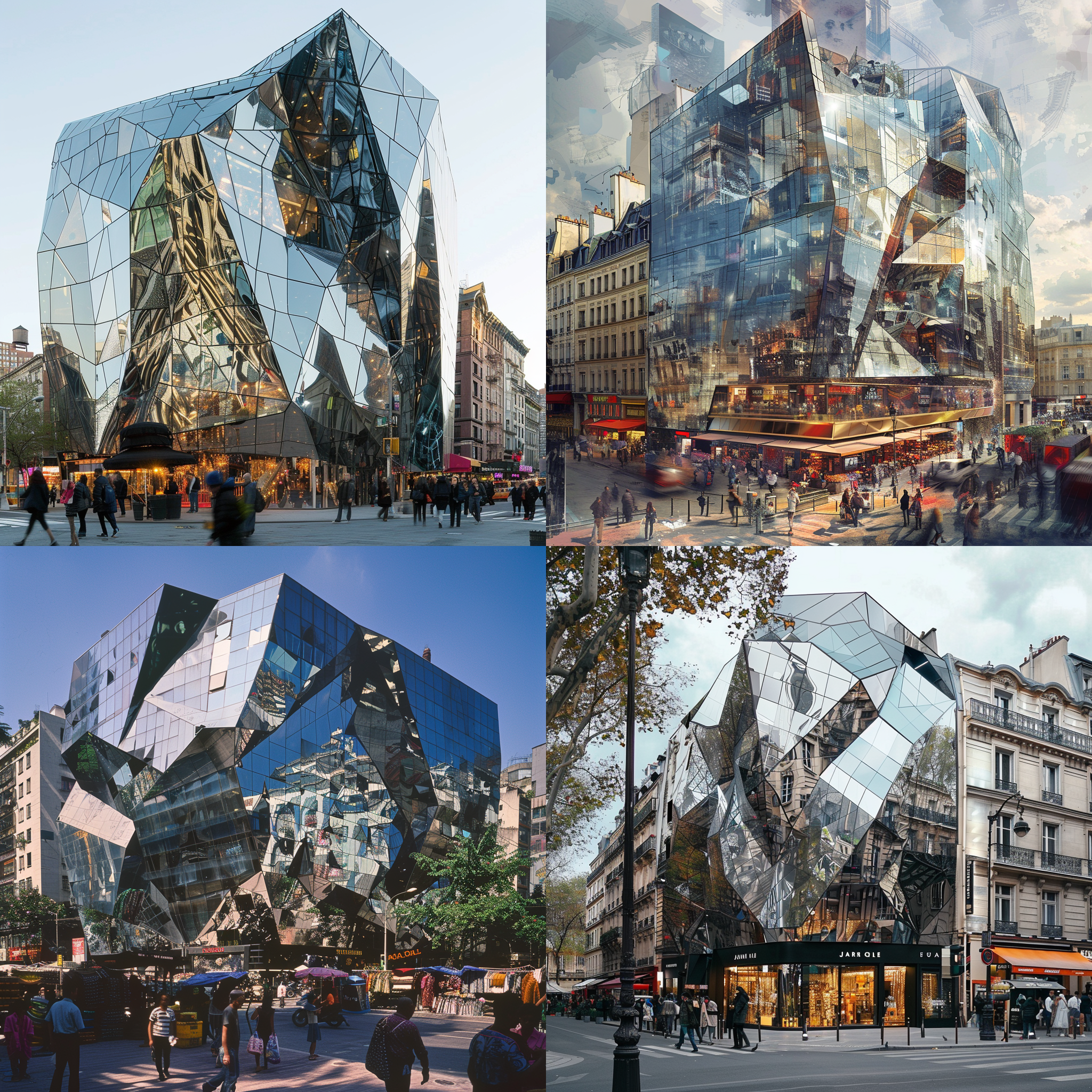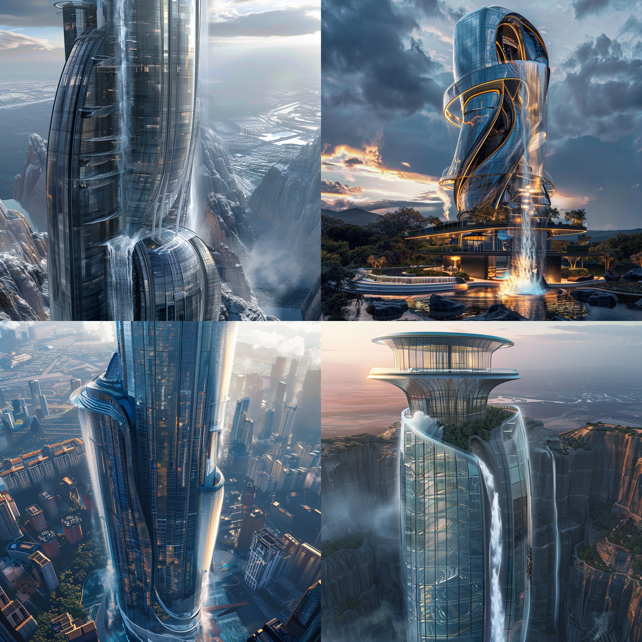- “A towering, spiraling skyscraper in the style of Zaha Hadid, made entirely out of reflective glass, with a waterfall cascading down the side and a spacious, futuristic observation deck on top.”