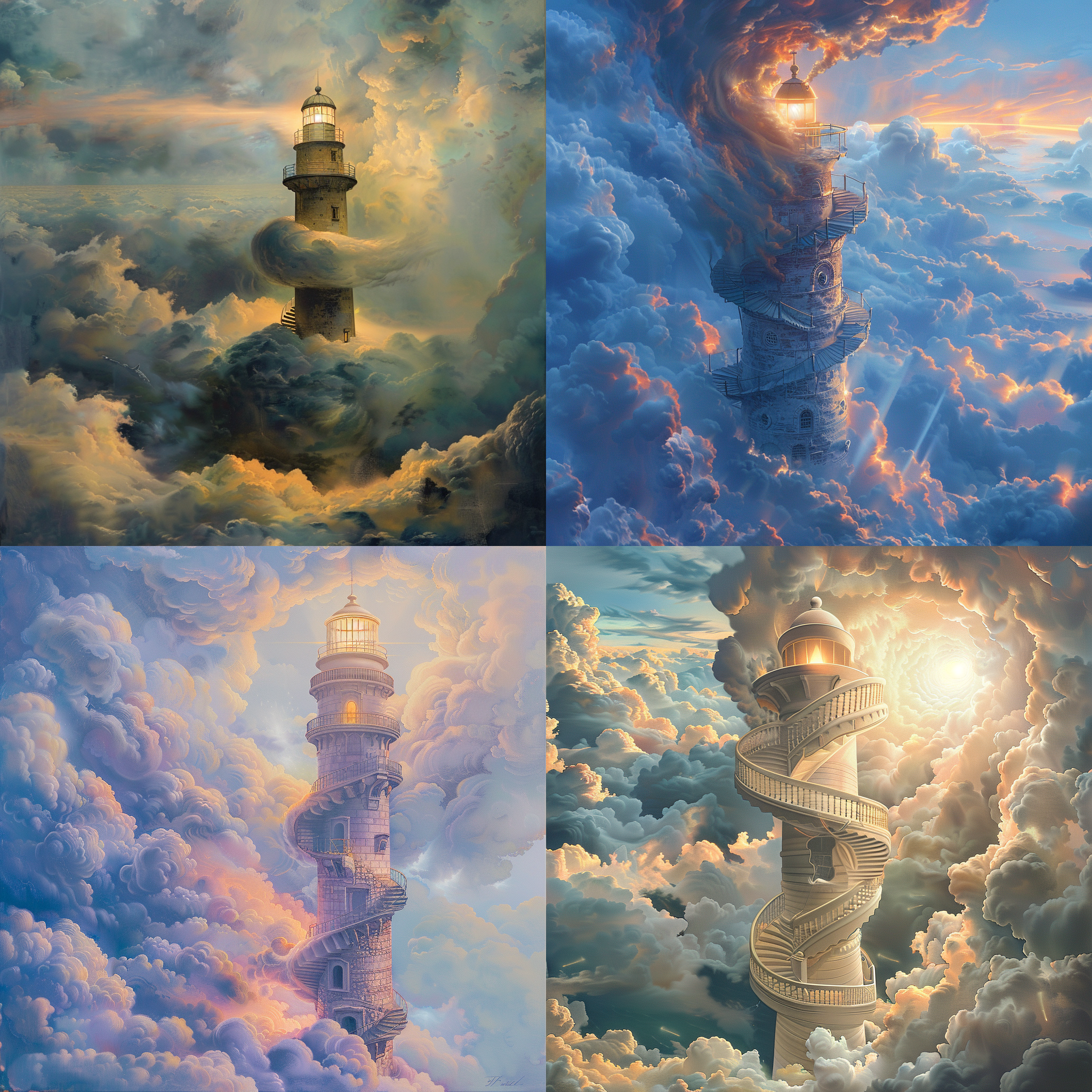 고요한 잉어 연못과 젠 정원으로 둘러싸인 미니멀리스트 일본식 찻집입니다. 섬세한 수채화 스타일로. - A surrealist lighthouse, with a spiraling tower and a rotating light, surrounded by a sea of clouds. In the style of a dreamlike oil painting.