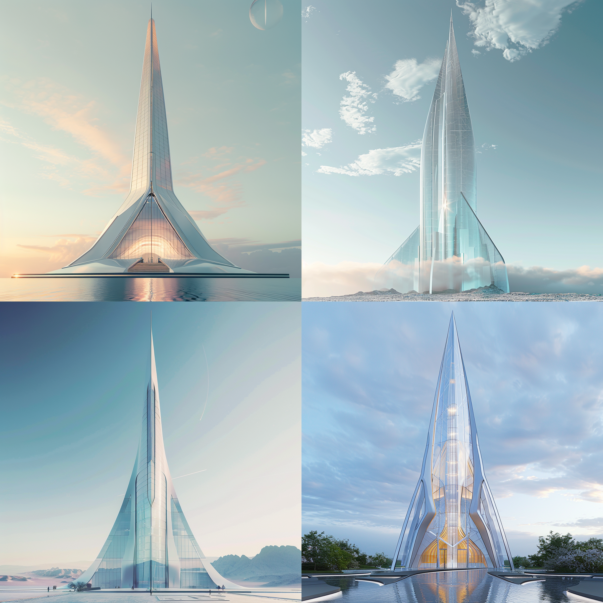 - A futuristic cathedral made entirely of glass, with a minimalist design inspired by the works of I.M. Pei, but with a towering spire reaching towards the sky. In the style of a 3D render.