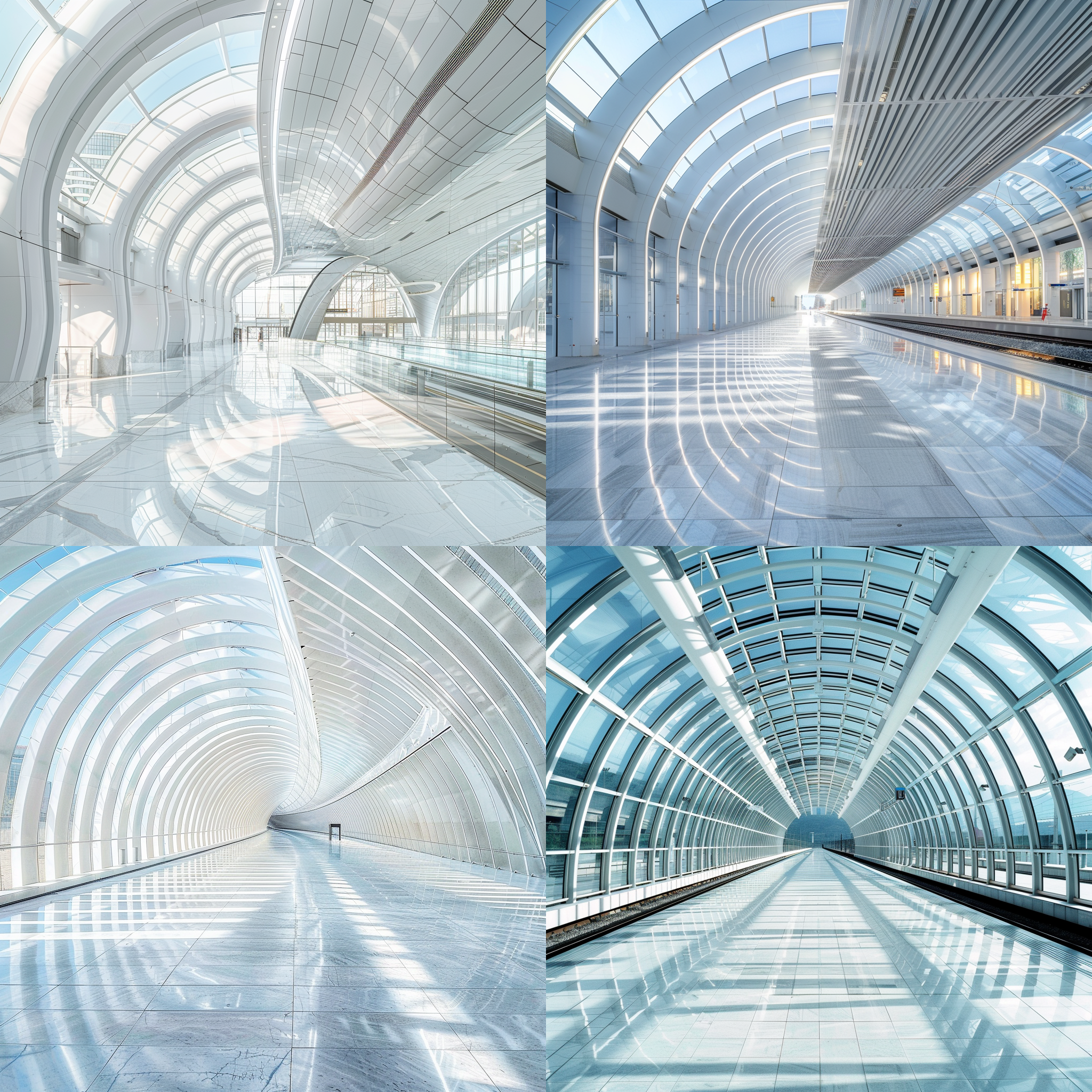 비트루비우스(Vitruvius) 양식으로 건축된 고대 로마 양식의 사원으로 높이 솟은 기둥과 복잡한 조각이 특징입니다. - An ultra-modern and sleek train station, inspired by the works of Santiago Calatrava, with a curved glass roof and bright white marble floors.