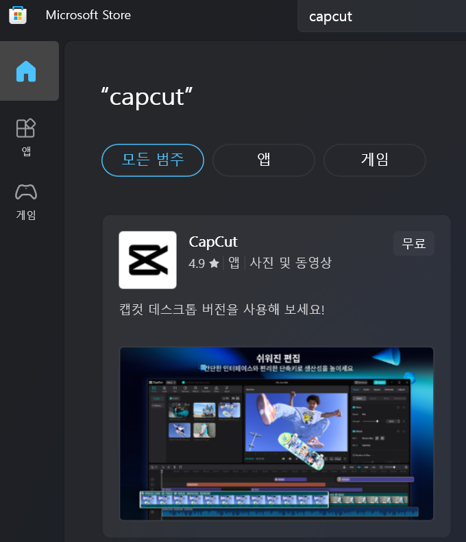 마이크로 소프트 스토어에 접속 후 capcut을 검색 합니다.