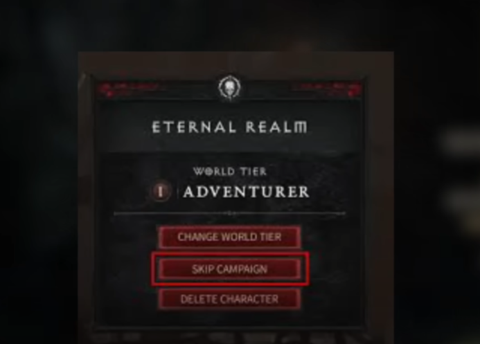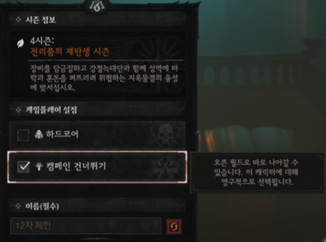 4. 복귀 유저는 캐릭터를 생성하면서 캠페인 건너뛰기를 할 수가 있는데, 캐릭터를 생성할때 캠페인 건너뛰기를 선택하면 됩니다. 캠페인 건너뛰기를 하게 될 경우에는 곧바로 증오의 그릇 캠페인을 시작 할 수 있습니다.