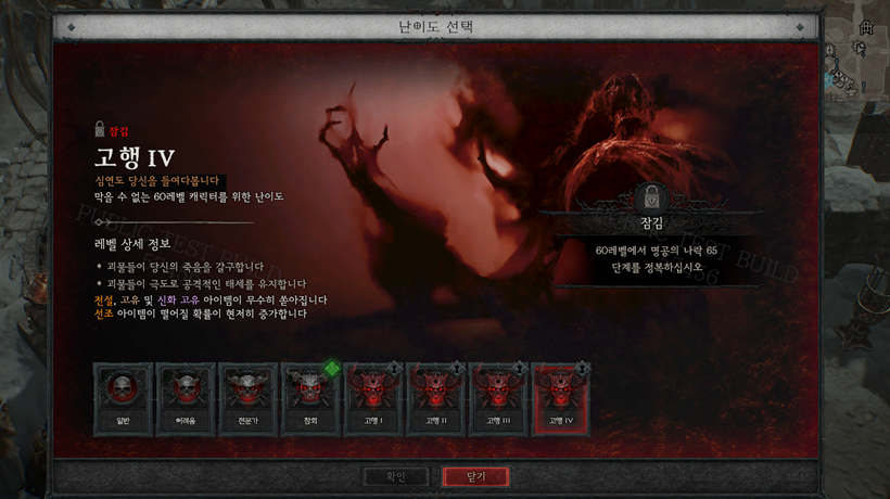 8. 디아블로4 난이도 시스템이 개편 되었으며 확장팩 만렙 60레벨 이전까지는 일반, 어려움, 전문가, 참회자 난이도가 존재 합니다. 참회자는 레벨 50에 도달하면 열리고 전문가는 디아블로4의 프롤로그를 완료한 이후에 열립니다.(키요바샤드까지 와야 됨)