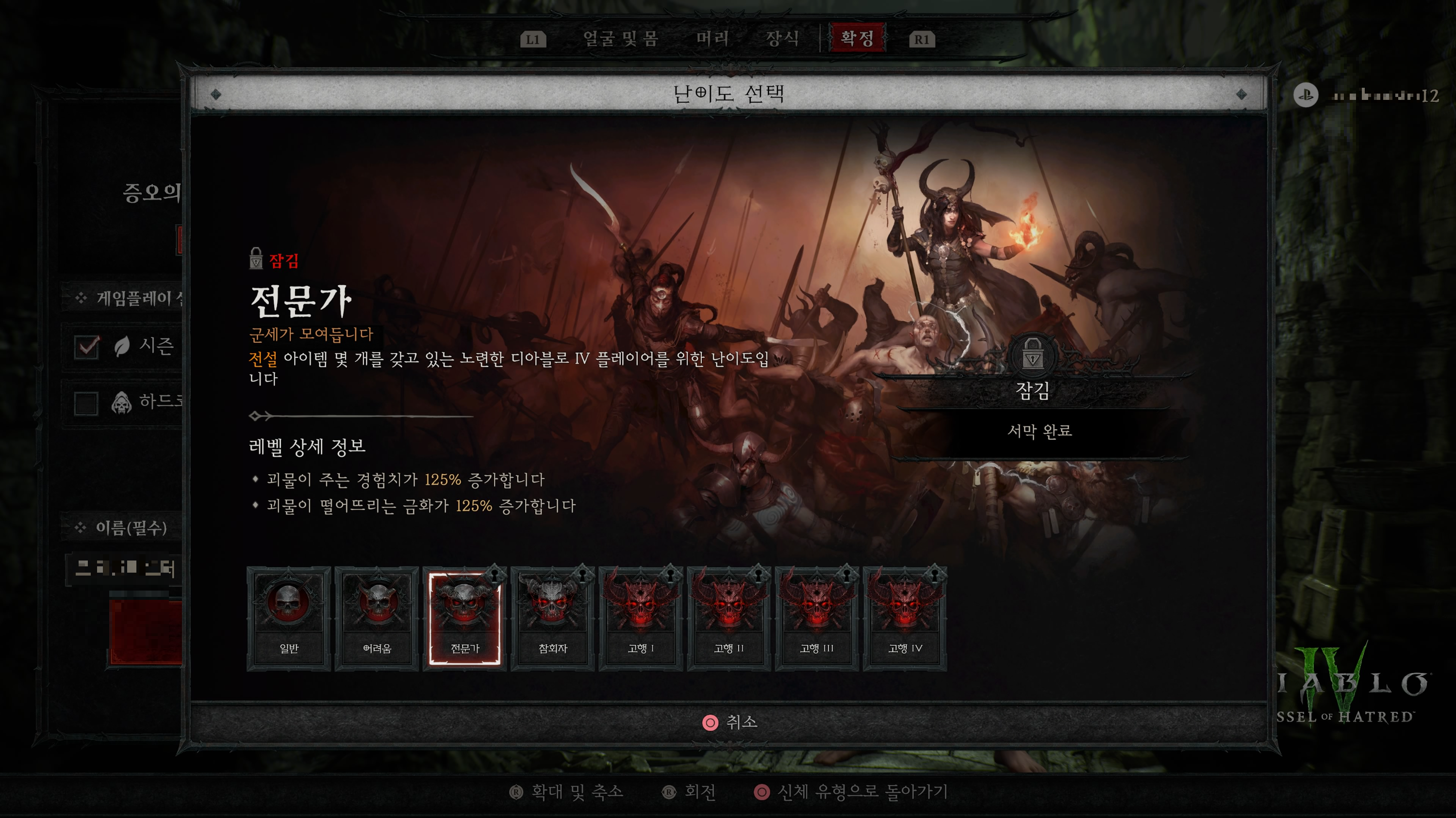 전문가 난이도는 서막을 완료하면 해금되며 경험치와 금화가 125% 증가한다