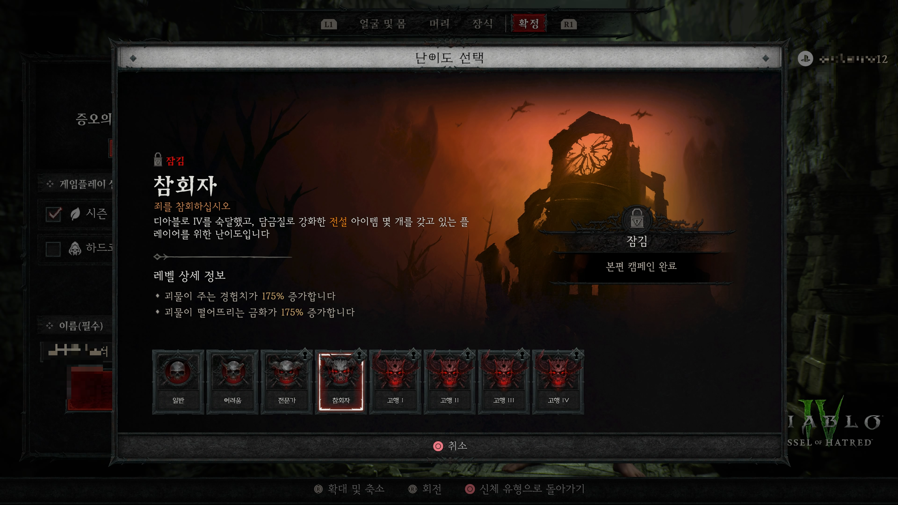 참회자 난이도는 본편 오리지널 디아블로4 캠페인을 완료하면 해금되며, 증오의 그릇 서막을 완료해야지만 같이 해금된다. 경험치 및 금화가 175% 증가한다.