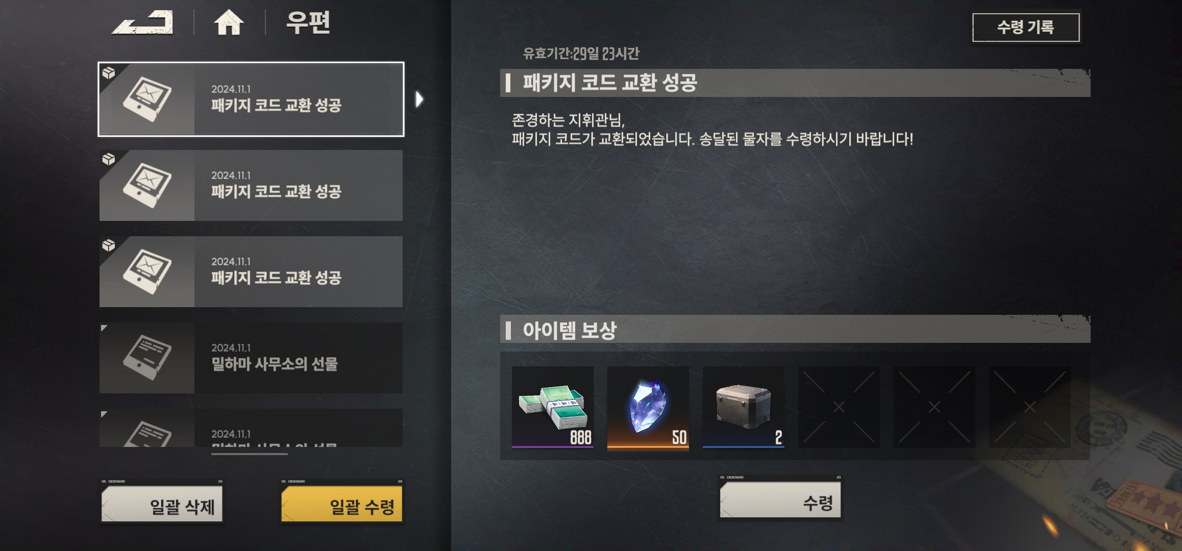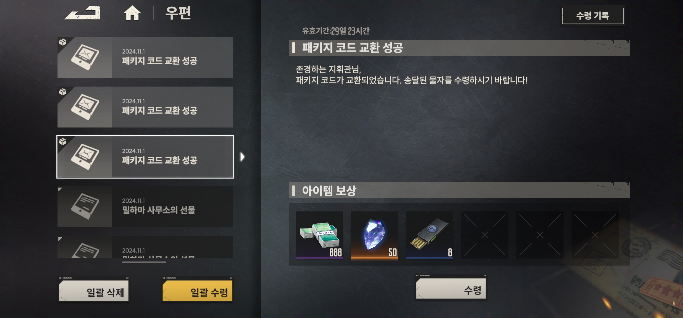 아래는 쿠폰번호 3개 모두 입력하면 받게 될 아이템 보상입니다