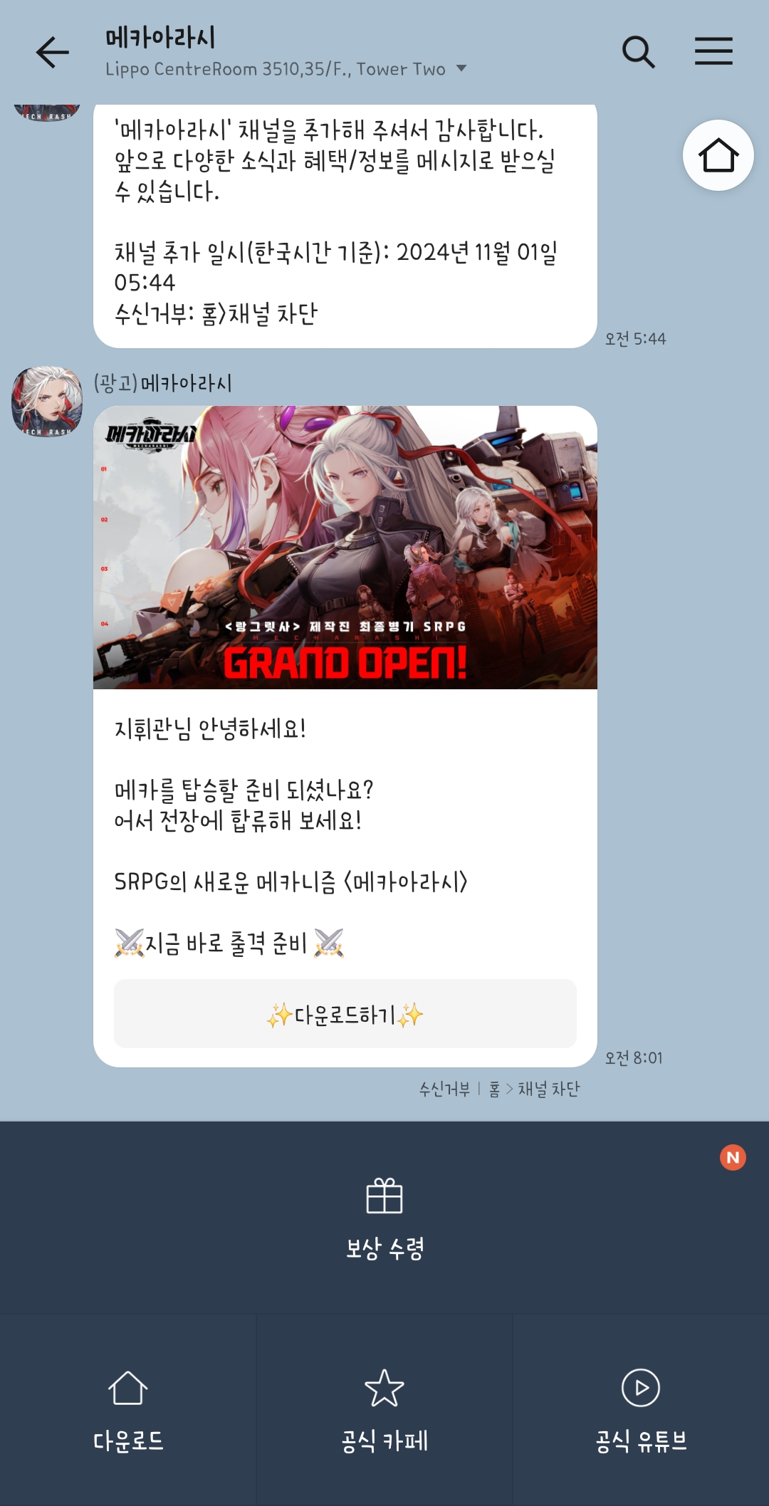 채널 추가하면 아래에 보상 수령 버튼 클릭 합니다