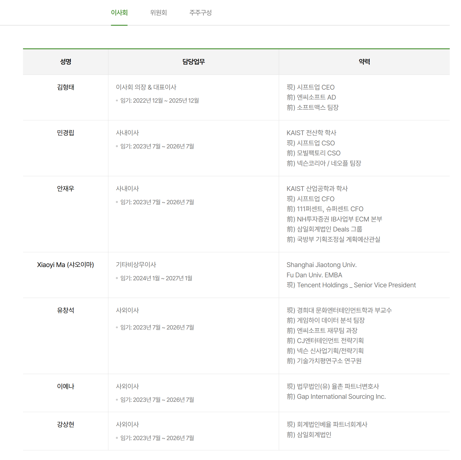 밸류에이션(Valuation): 주가 하락으로 시프트업의 투자지표는 부담이 다소 완화된 상태입니다. 현재 **주가수익비율(PER)**은 약 18배 수준으로, 향후 12개월 선행 PER 기준 약 14~16배로 추정됩니다. 이는 동종 국내 게임사 평균이나 글로벌 동종 업계 대비 무난한 수준의 밸류에이션으로 평가됩니다. 또한 **주가순자산비율(PBR)**은 약 3.8배 수준으로, 성공한 게임 IP를 여러 개 보유한 점을 감안하면 자본 대비 프리미엄이 반영된 수치입니다. 텐센트가 2대 주주로 **지분 35~40%**를 보유하고 있고 해외 기관투자자들의 참여로 상장 시 시가총액 약 3.5조 원을 인정받았던 만큼, 현재 시가총액 약 2.9조 원(2025년 4월 초 기준)도 향후 성장성 대비 과도하지는 않다는 평가가 있습니다. 다만 단일 게임 의존도가 높다는 사업 구조상의 리스크를 고려하여 동종 기업 대비 할인 요인이 존재한다는 점도 감안해야 합니다.