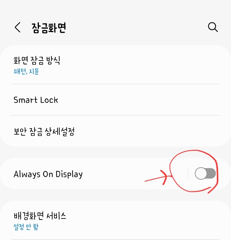 우선 설정에 잠금 화면으로 갑니다. Always On Display 기능을 OFF 합니다. 사실 이 기능이 편할 수 있으나 배터리를 지속적으로 계속 잡아먹기 때문에 OFF를 추천드립니다.