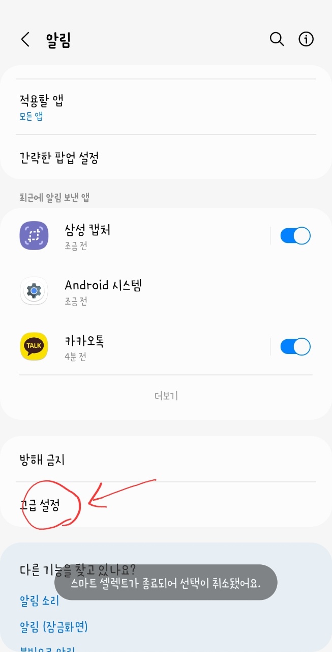 설정 > 알림으로 들어갑니다. (개인적으로 이런 건 홈 화면에 있어야 되는 거 아닌가? 라는 생각이 듭니다). 고급 설정을 클릭합니다.