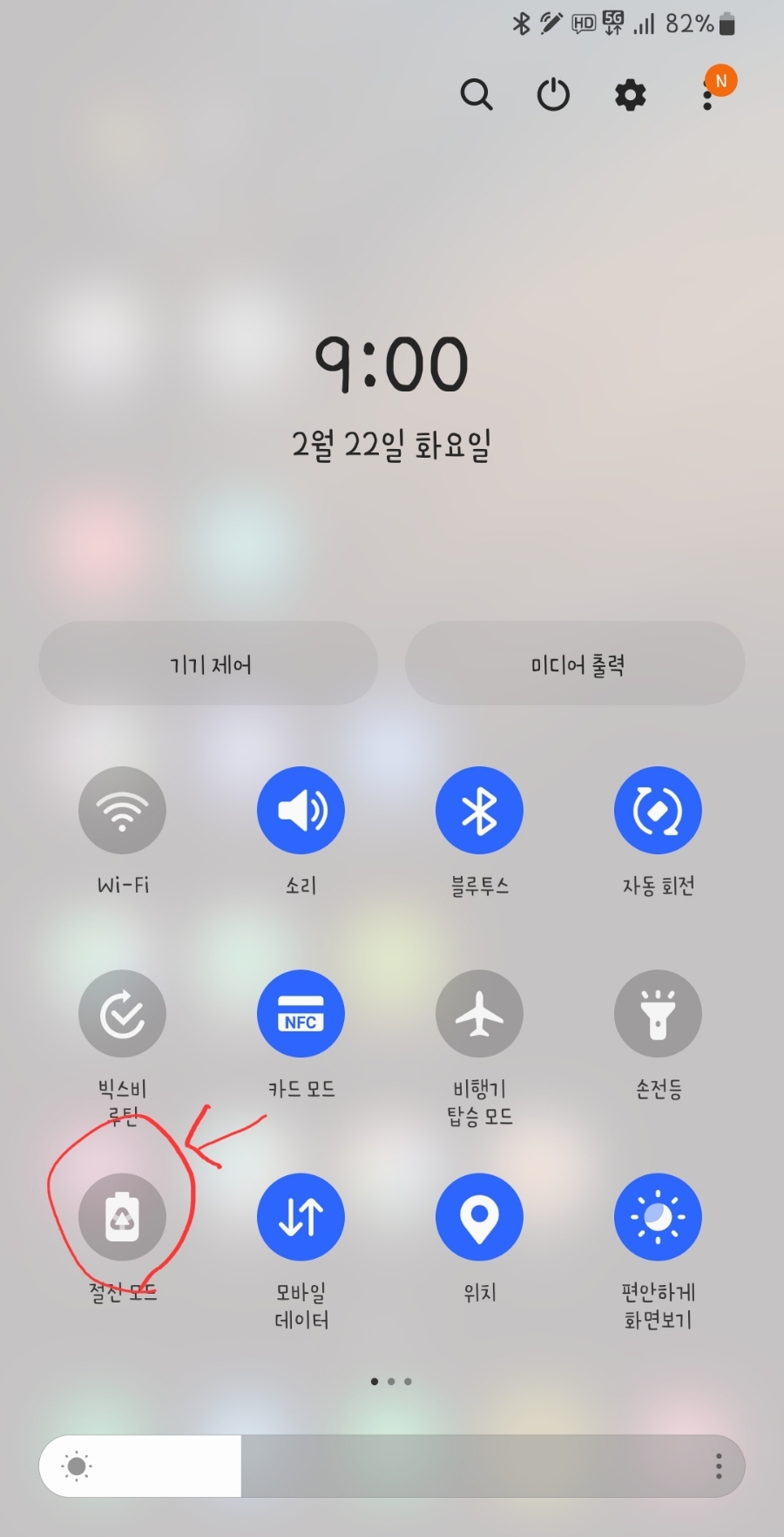 또한 절전 모드도 배터리 많이 아낄 수 있습니다. 이 기능은 CPU 속도 및 화면 밝기를 제어하기 때문에 배터리 소모가 적습니다. 절전 모드는 화면을 위에서 아래로 쓸어내리면 보이는 기능입니다. 터치만 하면 바로 ON 하실 수가 있습니다. 절전 모드가 CPU 속도를 제어하기 때문에 절전 모드에서 게임을 하면 느립니다. 그러니깐 게임하실 때는 OFF로 변경하시고 즐기세요.