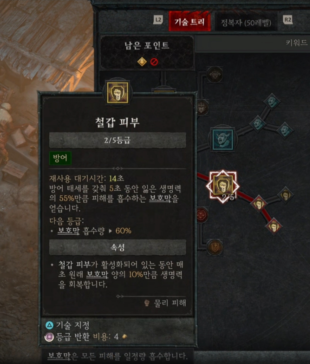 비약 외에 스킬을 이용해서도 몹을 쉽게 잡을 수가 있는데, 스킬(기술)에는 철갑 피부 입니다. 철갑 피부 레벨2 기준으로 설명을 드리면 5초 동안 잃은 생명력의 55%만큼 피해를 흡수하는 보호막을 얻고, 철갑 피부가 활성화 되어 있는 동안 매초 원래 보호막 양의 10%만큼 생명력을 회복 합니다.