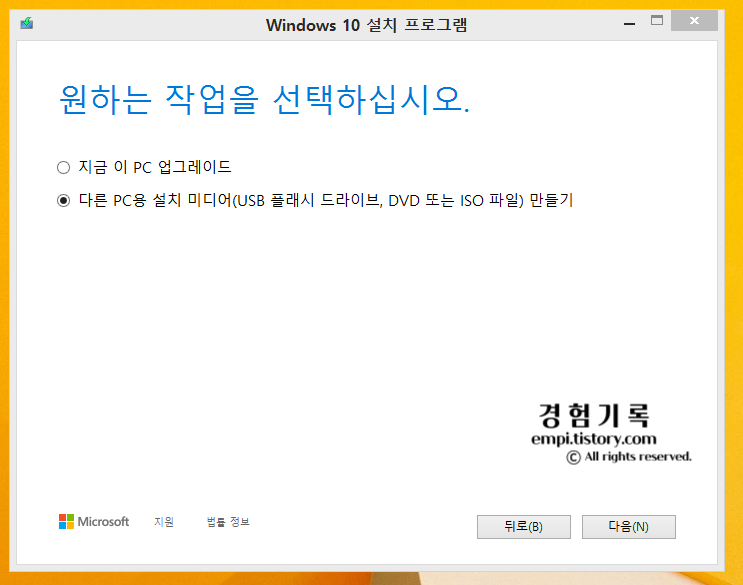 다른 PC용 설치 미디어를 선택 합니다. 검색 해보니 지금 이 PC 업그레이드는 에러 날수 있다고 합니다.