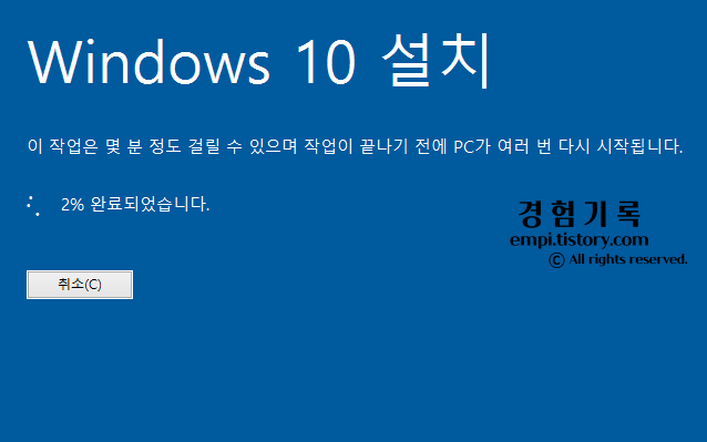 이제 본격적으로 윈도우 10 업그레이드가 시작 됩니다. 꽤 오랜 시간이 걸립니다. 대략 3시간 정도 소요 됐습니다.