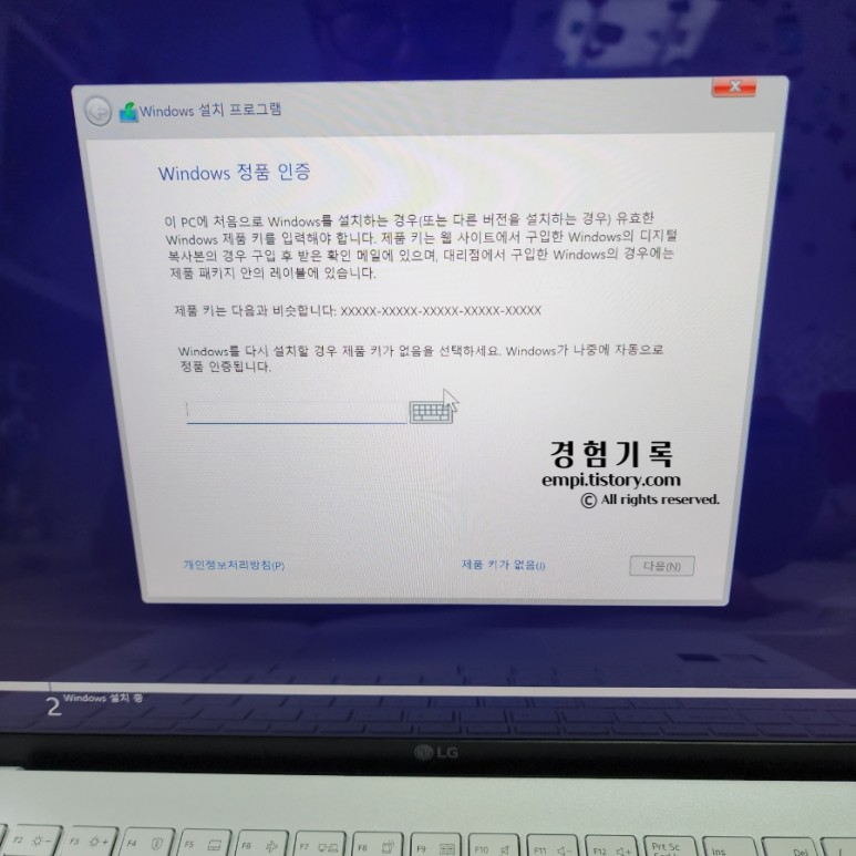 제대로 입력하면 다음과 같이 설치 진행이 가능합니다. 틀리면 진행 안됩니다. (제품키를 나중에 입력해도 되지만 저는 처음부터 입력 했습니다.)