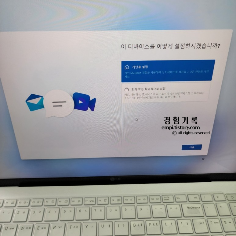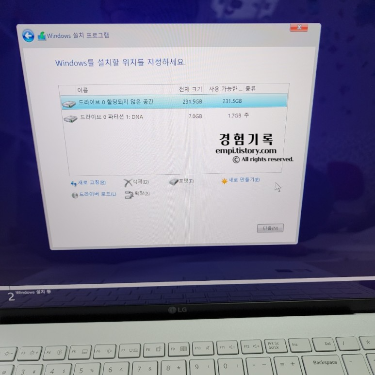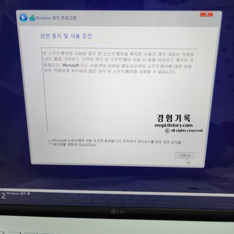 그럼 윈도우 설치화면이 나타납니다. 여기서 터치패드를 톡 하고 클릭하면 마우스 커서가 나타 납니다. 마우스 커서를 이용해서 다음을 진행합니다.