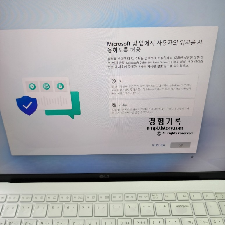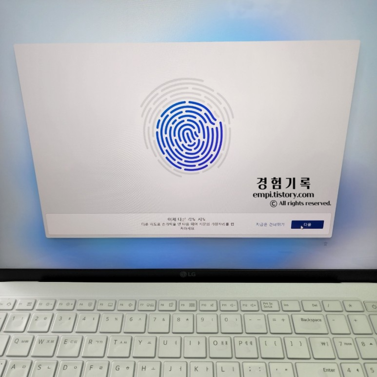 지문 등록을 해보겠습니다. 제가 15년만에 노트북을 구매 했는데, 이제 노트북에서도 지문인증이 되네요. 정말 편리합니다. 지문인증으로 노트북에 로그인 할 수 있습니다.