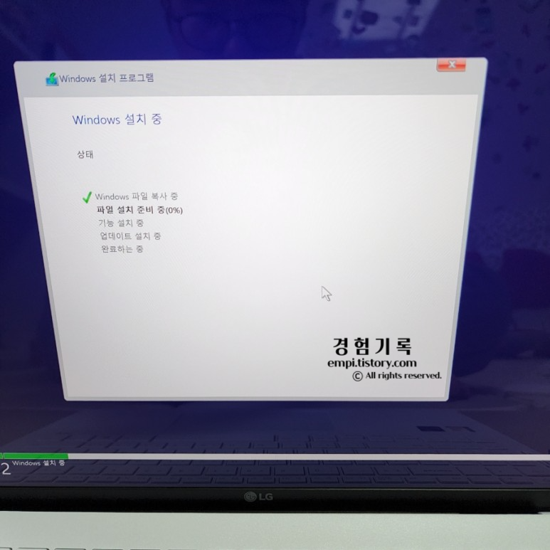 윈도우 설치 진행 중입니다. 생각외로 빨리 설치 됩니다. SSD라 금방 설치 되네요.