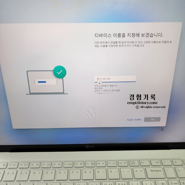 디바이스 이름은 영문숫자만 가능합니다. 이왕이면 본인이 알기 쉽게 지정하는 것이 좋습니다. 이유는 다른 장치와 연결할때 편리합니다.