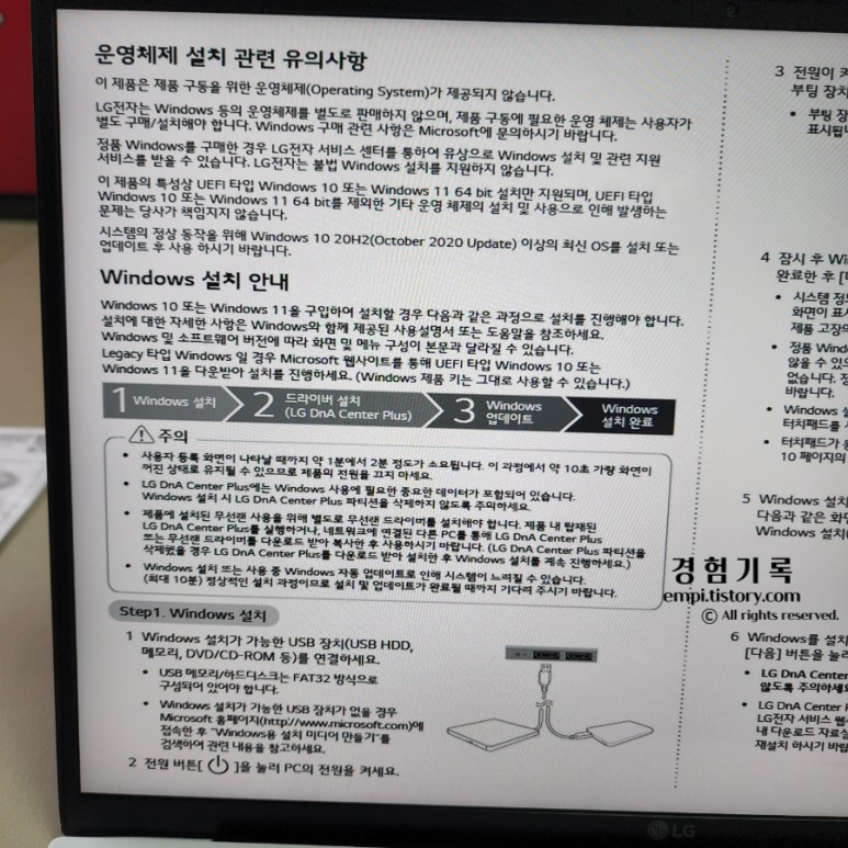 노트북을 켜면 사진과 같이 OS설치 방법이 자세히 나와 있습니다.