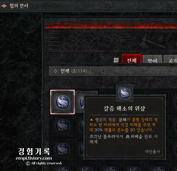 취득한 힘의 전서가 보입니다. 갈증 해소의 위상으로 분쇄가 출혈 상태의 적 최소 한 마리에 직접 피해를 주면 최대 30% 확률로 분노 20을 얻습니다.
