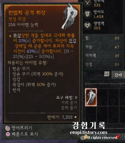 힘의 전서를 이용해서 전설 아이템을 만들어 보겠습니다. 전설 아이템은 파밍으로도 얻을 수 있지만, 레어 아이템에 위상 각인을 통해서 전설 아이템으로 변경 가능합니다.