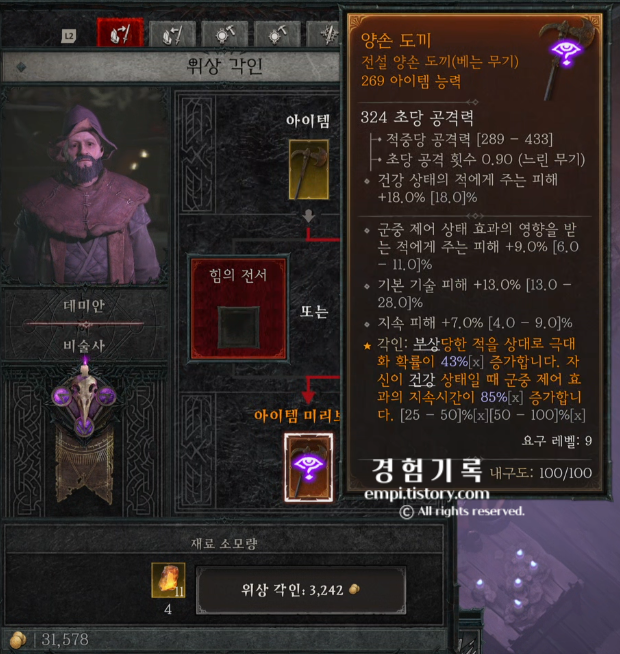 위상이 허용되는 아이템 유형은 한손 무기, 양손 무기, 장갑, 목걸이, 반지 등인데, 양손 무기에 각인을 해야 지만 위력이 100% 증가 되기 때문에 양손 무기에 각인을 해야 됩니다.
