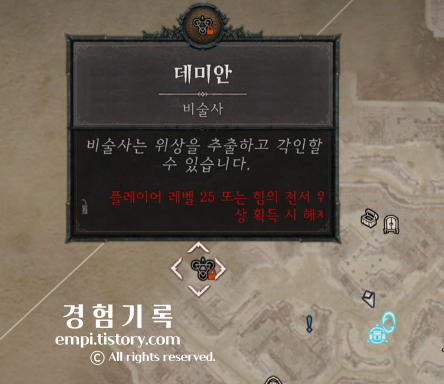 아이템에 위상을 추출 하거나, 각인 하기 위해서는 NPC인 비술사 데미안이 활성화 되어야 합니다. 비술사는 키요바사드 포털 기준으로 왼쪽에 위치하고 있습니다. 활성화가 되려면 레벨 25 이거나 힘의 전서 위상을 획득 하면 활성화 됩니다.