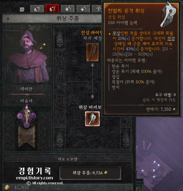 위상 추출에는 금화가 많이 필요 합니다. 위상에 따라 가격은 다를 것 같습니다. 추출하는 위상은 천벌의 공격 위상으로 부상당한 적을 상대로 극대화 확률이 21%증가하고, 자신이 건강 상태 일 때 군중 제어 효과의 지속 시간이 43% 증가 합니다. 군중 제어 효과 스킬이 있을 경우에 유리한 아이템 입니다.