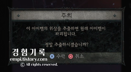 위상 각인을 추출하면 아래와 같이 원래 아이템이 파괴되는데, 정말 추출 하냐고 다시 묻습니다.