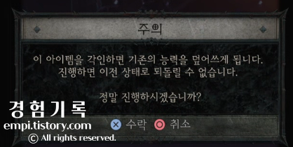 각인 비용은 미지의 수정 4개와 금화가 필요 합니다. 미지의 수정은 레어 아이템을 분해하면 얻을 수 있습니다. 다시 한번 확인 창이 나타 납니다. 레어 아이템 말고 기존 전설 아이템에 바로 사용 해도 됩니다. 그렇게 되면 기존 전설 아이템의 위상이 변경이 됩니다. 그래서 "기존의 능력을 덮어쓰게 됩니다" 라고 뜨는 것 같습니다.