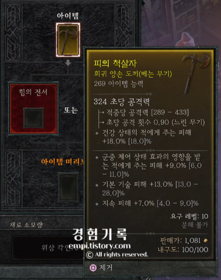 방금 추출한 위상은 양손 무기에 넣어야 위력이 상승하기 때문에 레어 양손 도끼를 사용합니다.