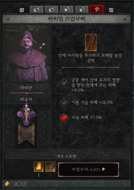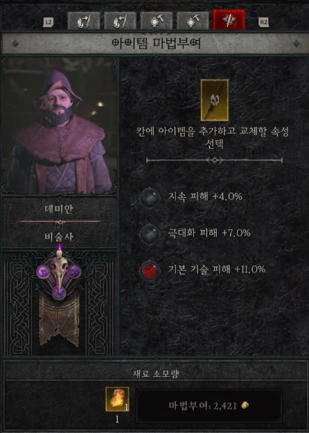 디아블로4의 전설템의 능력치 변경은 키요바샤드의 비술사인 데미안이 할 수 있습니다.