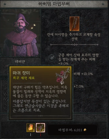 레어템의 능력치 변경(마법부여)에는 마귀장미는 필요하지 않습니다. 미지의 수정과 금화만 있으면 됩니다.