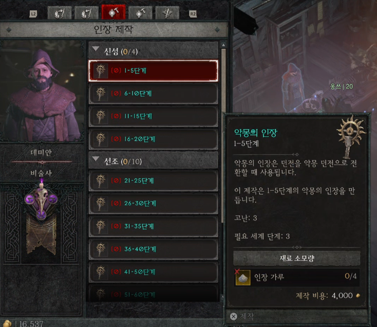 인장의 가루가 있다면 비술사에게서 인장 제작을 할 수가 있습니다. 악몽의 인장 제작에는 고난 3, 필요 세계 단계 3이 필요 합니다. 세계 단계 3은 악몽 난이도로 50레벨 부터 가능 합니다.
