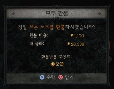 기술(스킬) 초기화는 레벨8 이전에는 무료로 초기화 할 수 있지만 레벨이 올라 갈 수록 초기화에 드는 금화의 양이 늘어 납니다. 스킬 초기화는 스킬 등록 화면 아래에 모두 환불 버튼을 이용해서 할 수 있고 플스 또는 컨트롤러, 콘솔 유저는 네모 버튼을 눌러서 초기화가 가능합니다.