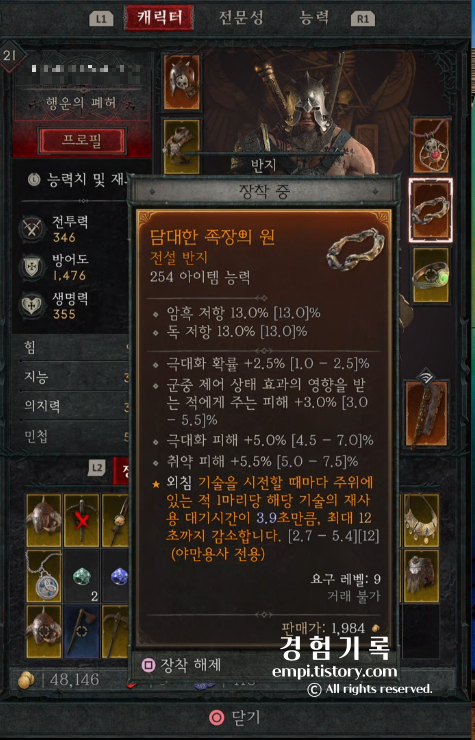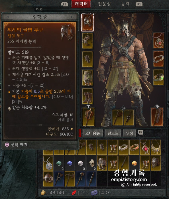 디아블로4 야만용사로 21레벨 까지 플레이 하면서 얻게된 전설 아이템 공유 합니다.