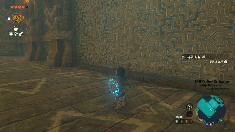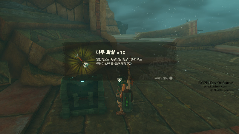 트레루프를 이용해서 다시 밖으로 나갑니다. 주변을 둘러 보면 보물상자랑 나무상자에서 화살이 많이 나옵니다. 여기서 화살을 많이 얻어야 됩니다. 나무상자는 꼭 부셔셔 안의 화살을 얻어야 됩니다.