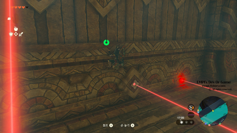 아래를 살펴 보면 레이저가 보이는데, 레이저에 몸이 닿지 않게 조심히 내려 가야 됩니다.