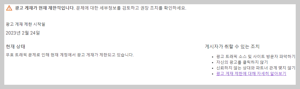 애드센스 [무효 트래픽 문제 광고 게재 제한] 조치(해결) 방법 상세히