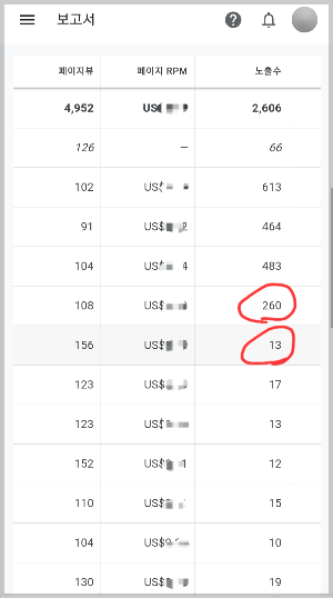 페이지뷰가 높지만 노출수는 급격히 줄어들면서 약95% 줄어 들게 됩니다. 약 5%이내에서 광고 노출이 이루어 진다는 거니깐 거의 안된다고 보셔야 됩니다. 광고 노출이 안되니 당연히 다른 수치들도 줄어들어 cpc, 페이지rpm, 클릭수, ctr 등 페이지뷰를 제외한 모든 수치가 줄어 듭니다.
